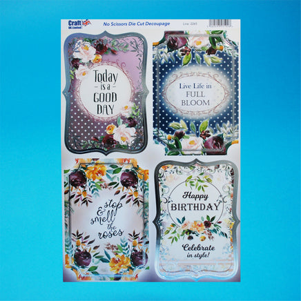 3D - Die Cut - A4 sheet with traditional floral illustrations in full colour, each in an individual pop out panel and including various sentiments with additional silver foiled borders and flourishes.