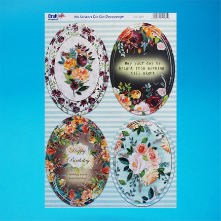 3D - Die Cut - A4 sheet with traditional with traditional full colour floral images set in oval borders, including ‘Birthday’ sentiments and silver foiled decorative highlights.