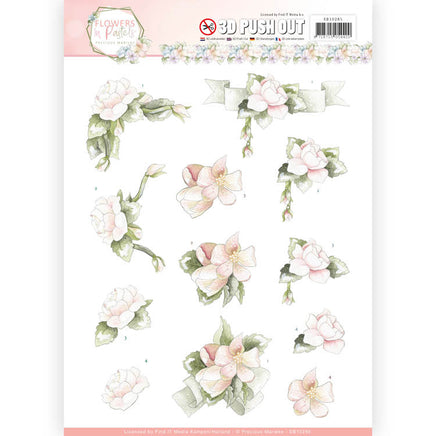 3D Pushout - Precious Marieke - Flowers in Pastels - Believe in Pink Description SB10285 A fantastic die-cut decoupage sheet with three 3D images. Images can be pushed-out of the sheet so there’s no need for scissors. Especially convenient for them who have trouble cutting out fine details