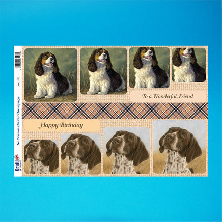 A4 sheet Pets die cut Decoupage. Superb canine illustrations with various sentiments and including gold foiled borders