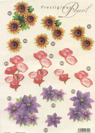 3D - Die Cut - Prestigious Pearl - Poppies and Sunflowers Prestigious Pearl Florals. Printed on white 230gsm pearlescent board. Each Sheet Makes 3 Unique cards.