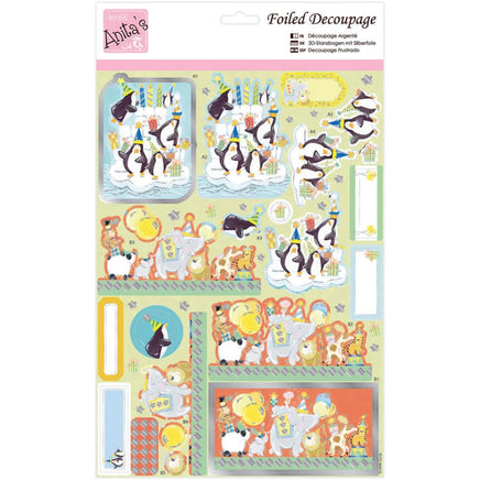 DOCRAFTS - Anita's-Penguin Birthday A4 Foiled Decoupage Sheet. The ideal addition to your cards, scrapbooks and more! This package contains one 11-3/4x8-1/4 inch sheet of foiled decoupage pieces. Non-toxic. Acid and lignin free. Imported.