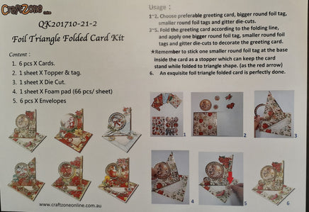 QK201710-21-2 PACKET CONTAINS: 6 Triangle fold Printed Cards 300 gsm 1 Die-cut Sheet Toppers & Tags 300 gsm 1 3D Die-cut Sheet A4 300 gsm 1 pkt foam sheet 6 envelopes Instructions makes at least 6 cards