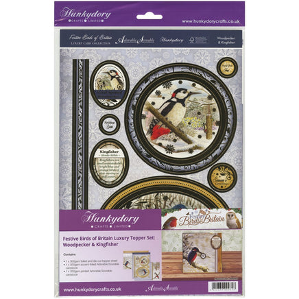 Festive Birds of Britain Woodpecker and Kingfisher contains: 1 x 300 gsm foiled and die cut sheet A4 1 x 350 gsm accent foiled cardstock A4 1 x 350 gsm printed cardstock A4 makes at least 2 cards.