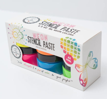 Art by Marlene stencil paste is a creamy, metallic neon paste. Use a stencil and a palette knife to apply the paste to your project. Or apply a thin layer directly to the surface for a metallic look. Clean tools and brushes with soap and water while the paste is still wet. Part of the 25 collection by Art by Marlene. 6 colours/6 jars. x 50ml