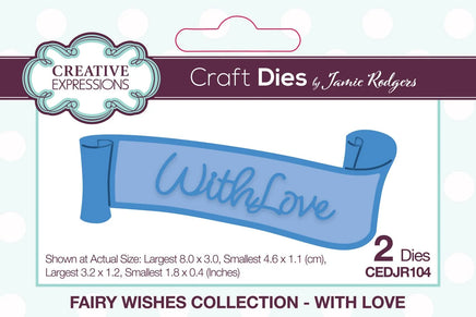 The With Love Craft Die from Jamies's Fairy Wishes collection is perfect to add the finishing touch to all your cards and paper craft projects. This die set will work beautifully with the other dies in the collection. The high quality steel dies are compatible with most home die cutting machines. Made In China. 2 dies. Size 8.0 x 3.0 cm (3.2 in x 1.2 in).