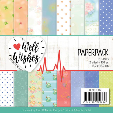 Paperpack - Jeanine's Art - Well Wishes Description JAPP10014 This 6 x 6” paper pack (15,2 x 15,2 cm) contains 23 2-sided patterned sheets in 16 designs that co-ordinate beautifully with the other products of the range.