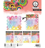 Place the stencil on your cardstock. Tape it down with a piece of temporary adhesive to prevent the stencil from moving. Use a blending tool, dap it in an ink pad and go over you stencil in round movements. Use as many colours as you want. Clean your stencil with a baby wipe.