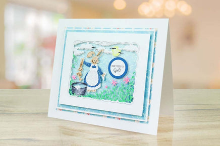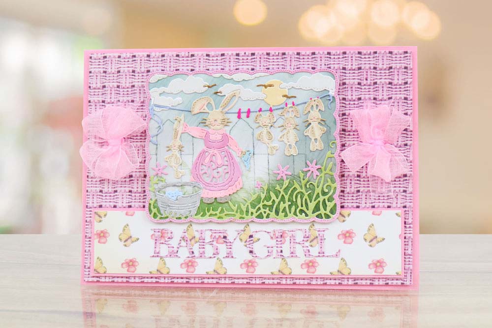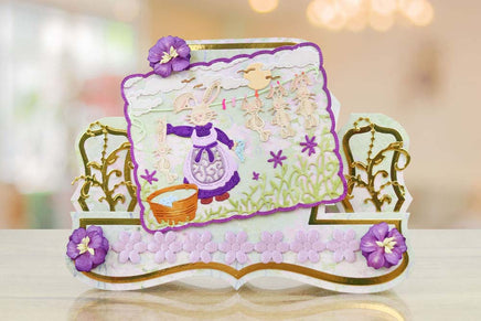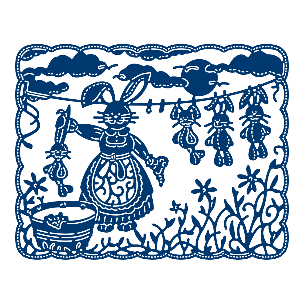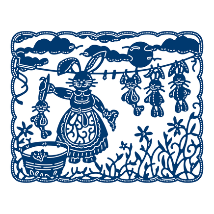 This Tattered Lace tapestry die features a mother bunny washing her baby bunnies and hanging them up on the line, giving a comical feel to the die cut. The scene sits inside of a square scalloped edge with incredible detailing of clouds, flowers, soap, bubbles and pegs down to birds flying into the distance to give an impressive finish to you projects. You could snip out individual elements to the die and layer them up to create a dimensional focal point, even back foam tape behind for added depth. This die would work perfectly with coloured pens to highlight details and create shading and movement within the die cut for extra wow factor.
