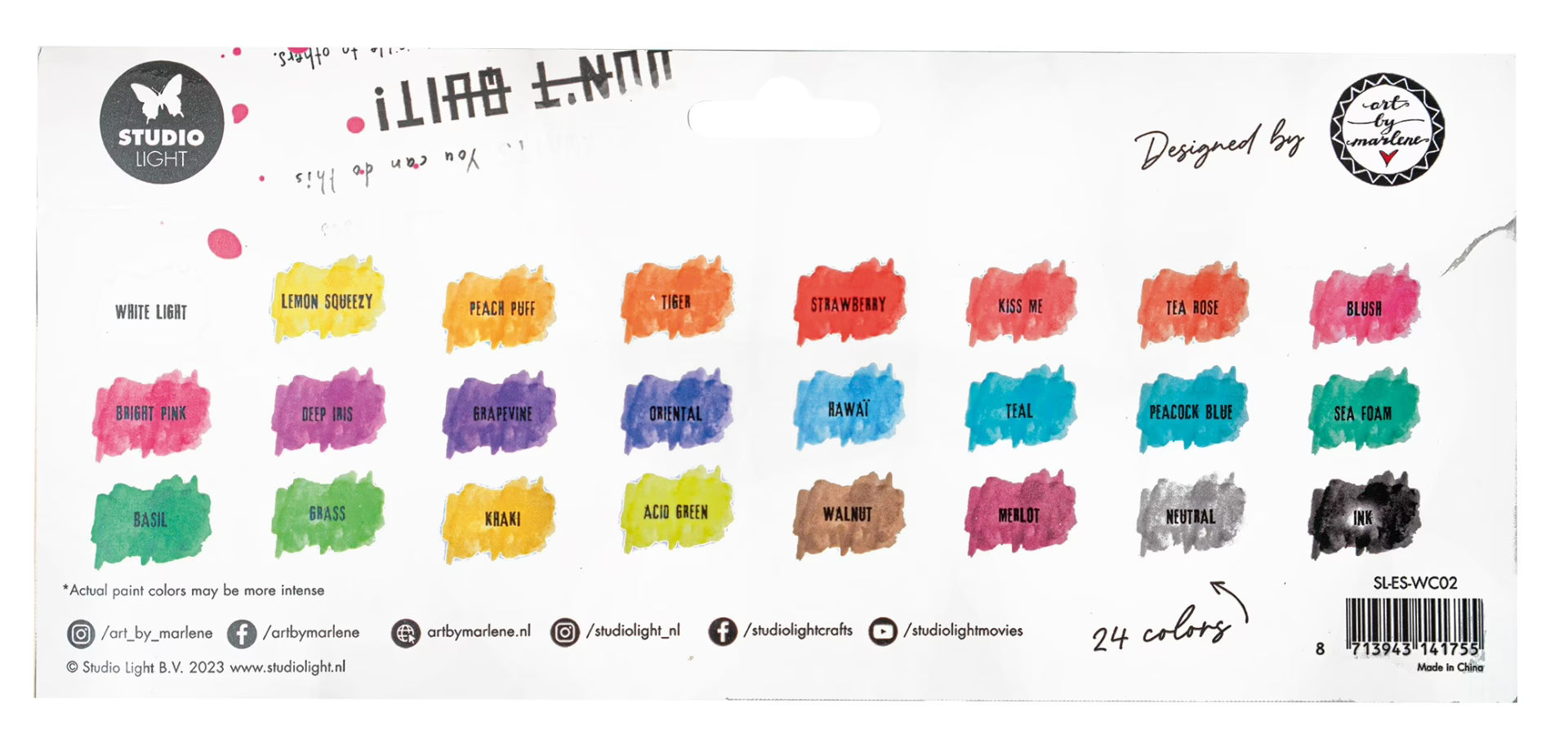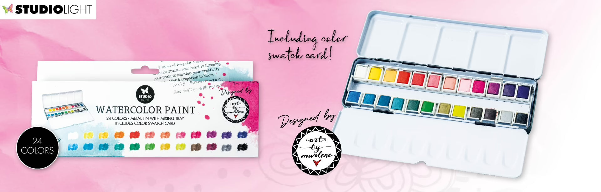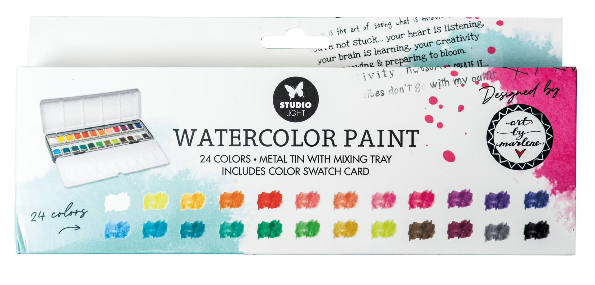 This watercolor set in a metal pocket box contains 24 bright colors and was created by Marlene Meijer-van Niekerk of Art by Marlene. The box offers ample mixing space in the lid, yet is also compact at 22 x 7 cm. This makes it easy to store and convenient to travel with. This watercolor set contains the most essential colors for a variety of creative projects. Unleash your creativity and create beautiful works of art with this Studio Light watercolor set from Art by Marlene. Part of the Essentials by Marlene collection.